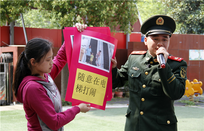 除了火災,電梯、防盜窗等日常小朋友經常接觸的地方,也是消防事故的常發點。為了讓小朋友牢記相關的注意事項,消防員叔叔拿著印有各種消防事故畫面的泡沫板,一遍遍提醒孩子們如何避免這些消防情況的發生。